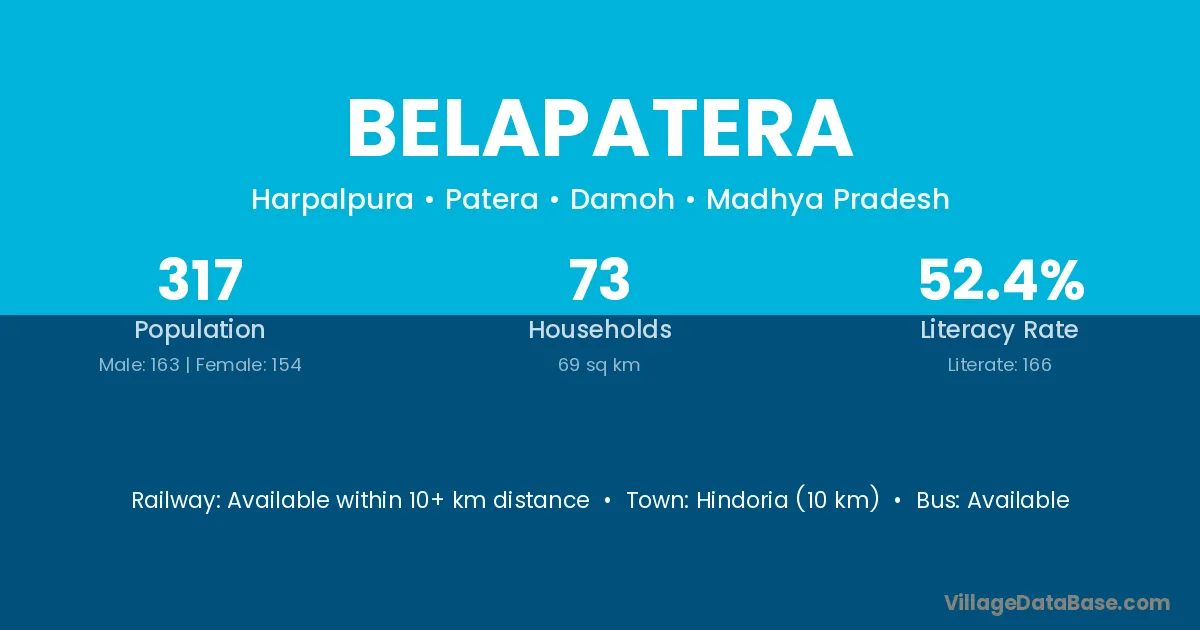 Hindoria (10 km) is the nearest town to Belapatera village for major economic activities and is located approximately 10 km away.