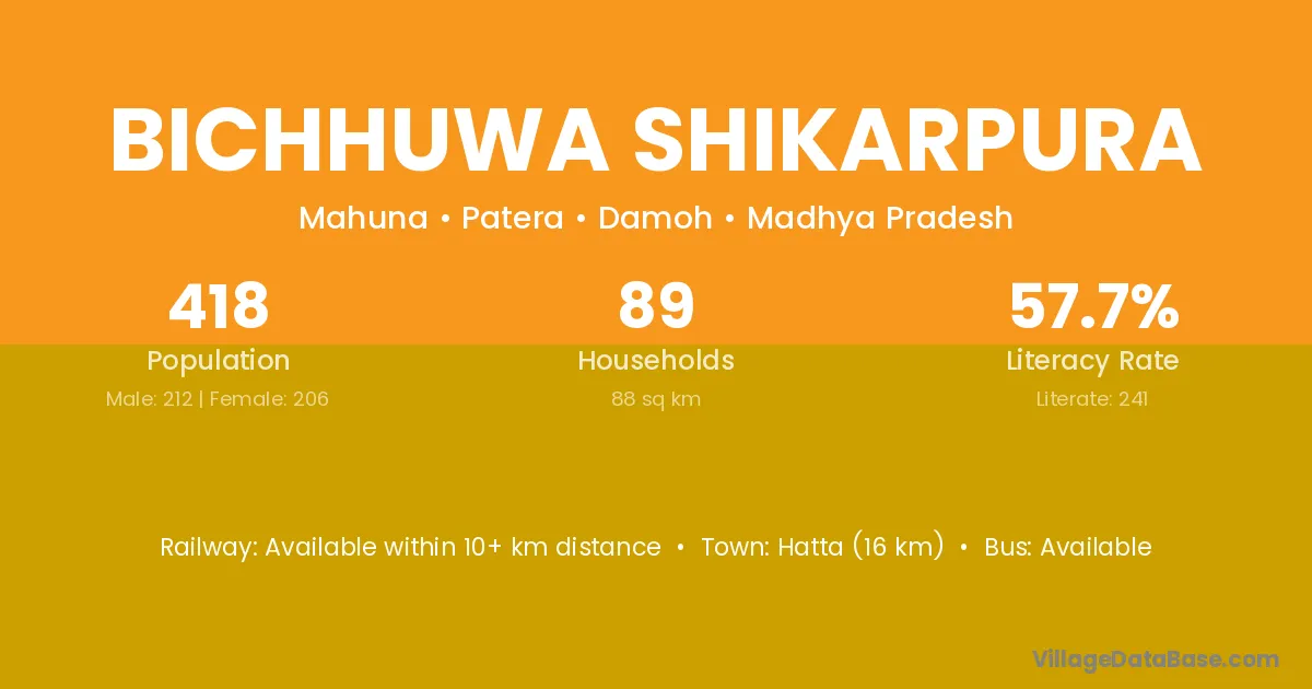 Bichhuwa Shikarpura village has a total population of 418 people, of which 212 are males and 206 are females.