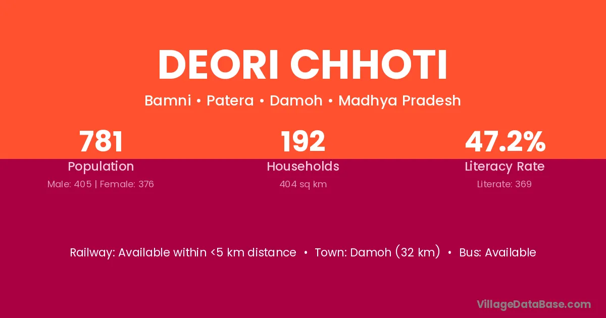 Damoh (32 km) is the nearest town to Deori Chhoti village for major economic activities and is located approximately 32 km away.