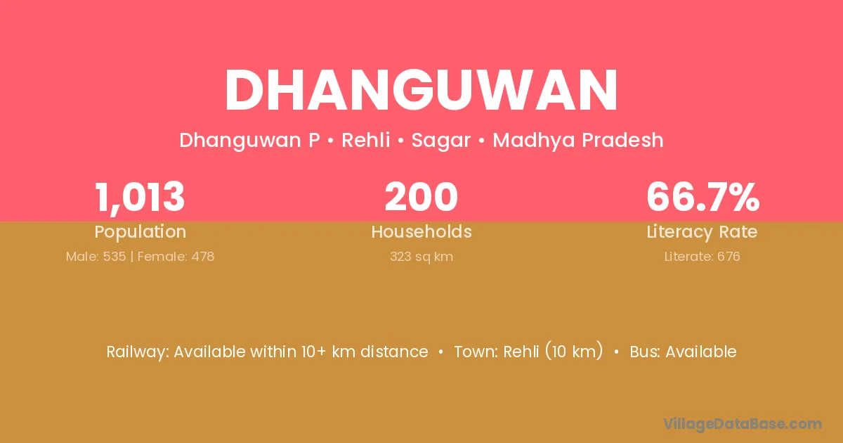 Damoh (45 km) is the nearest town to Dhanguwan village for major economic activities and is located approximately 45 km away.