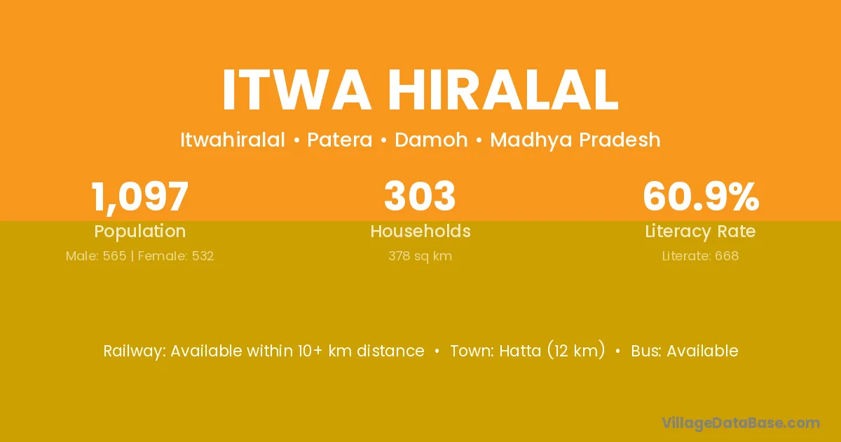 Itwa Hiralal village has a total population of 1,097 people, of which 565 are males and 532 are females.