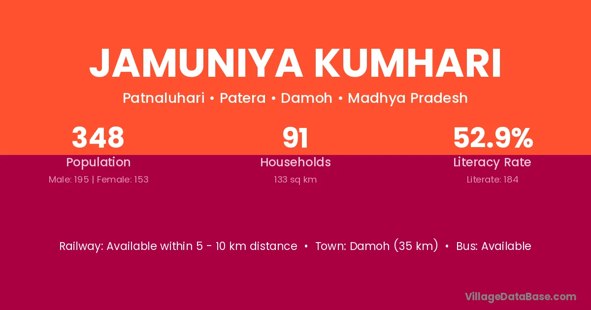 Damoh (35 km) is the nearest town to Jamuniya Kumhari village for major economic activities and is located approximately 35 km away.