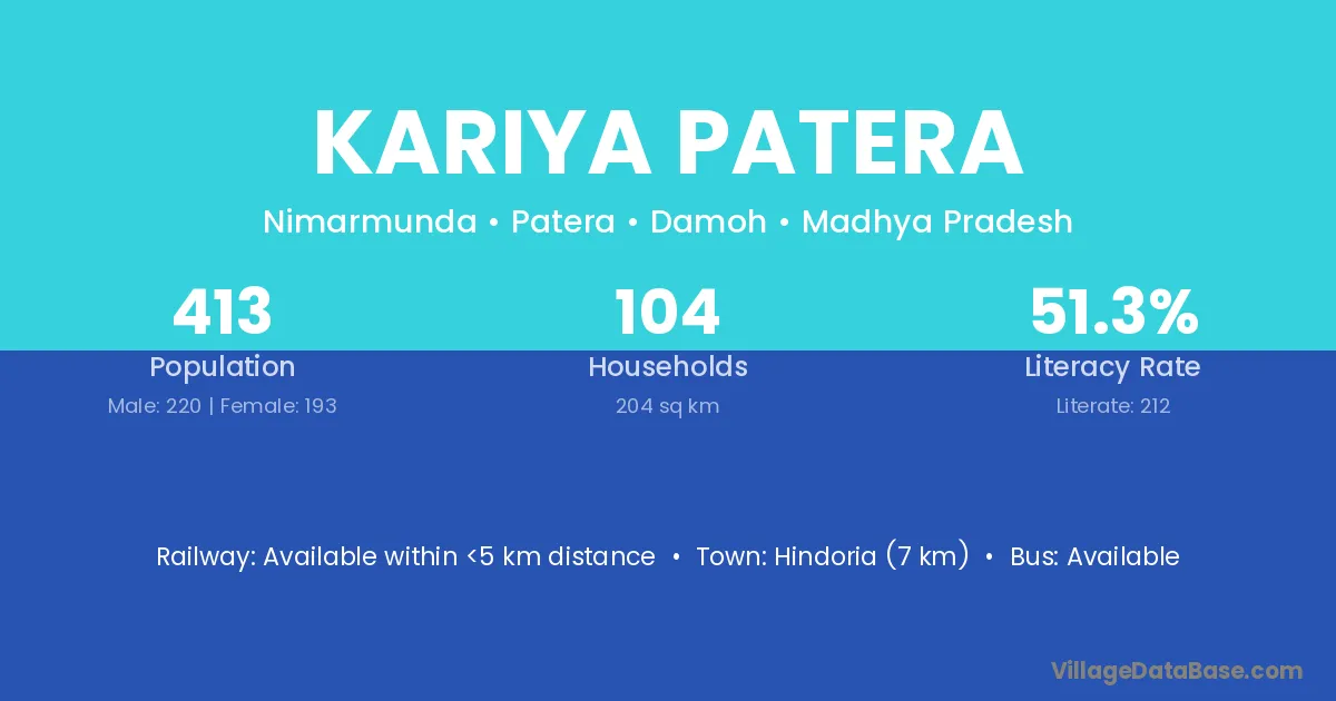 Kariya Patera village has a total population of 413 people, of which 220 are males and 193 are females.