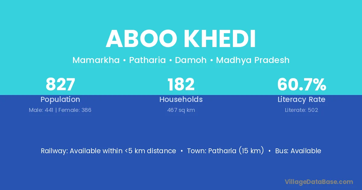 Patharia (15 km) is the nearest town to Aboo Khedi village for major economic activities and is located approximately 15 km away.