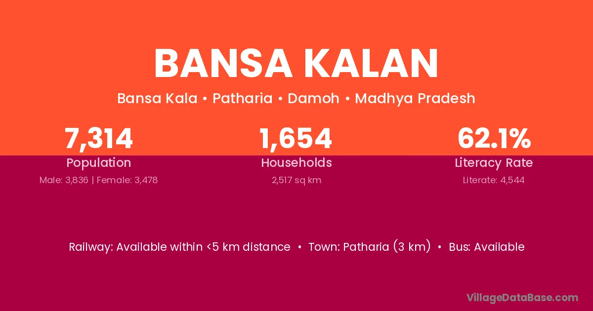 Patharia (3 km) is the nearest town to Bansa Kalan village for major economic activities and is located approximately 3 km away.