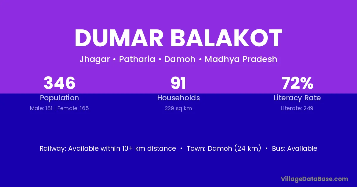Damoh (24 km) is the nearest town to Dumar Balakot village for major economic activities and is located approximately 24 km away.
