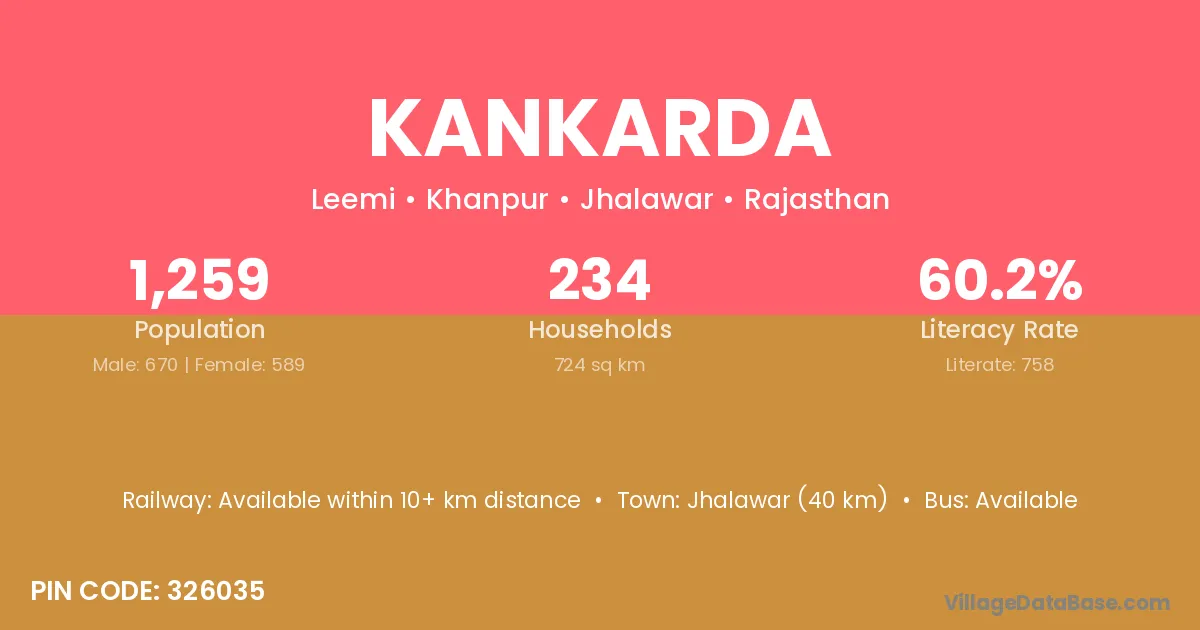 The literacy rate of Kankarda village is 54.75%. Male literacy stands at 66.17% and female literacy at 42.77%.