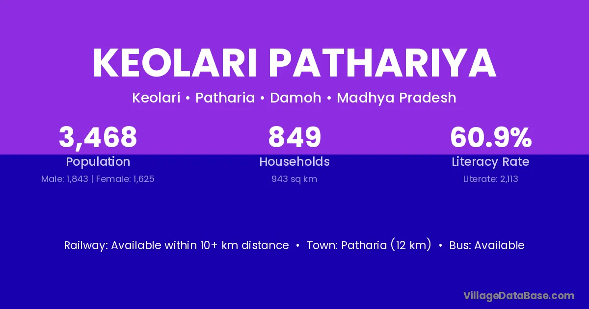 Keolari Pathariya village has a total population of 3,468 people, of which 1,843 are males and 1,625 are females.
