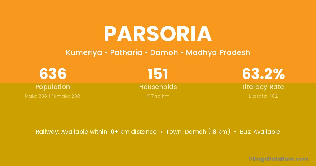 Damoh (18 km) is the nearest town to Parsoria village for major economic activities and is located approximately 18 km away.
