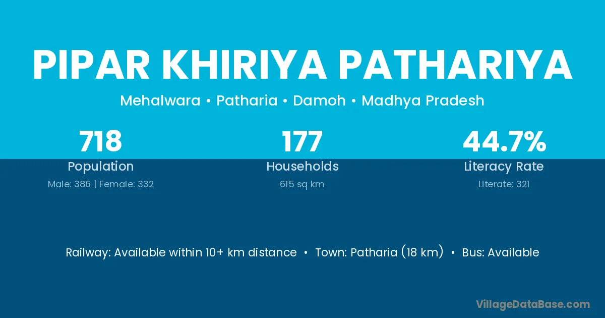 Pipar Khiriya Pathariya village has a total population of 718 people, of which 386 are males and 332 are females.