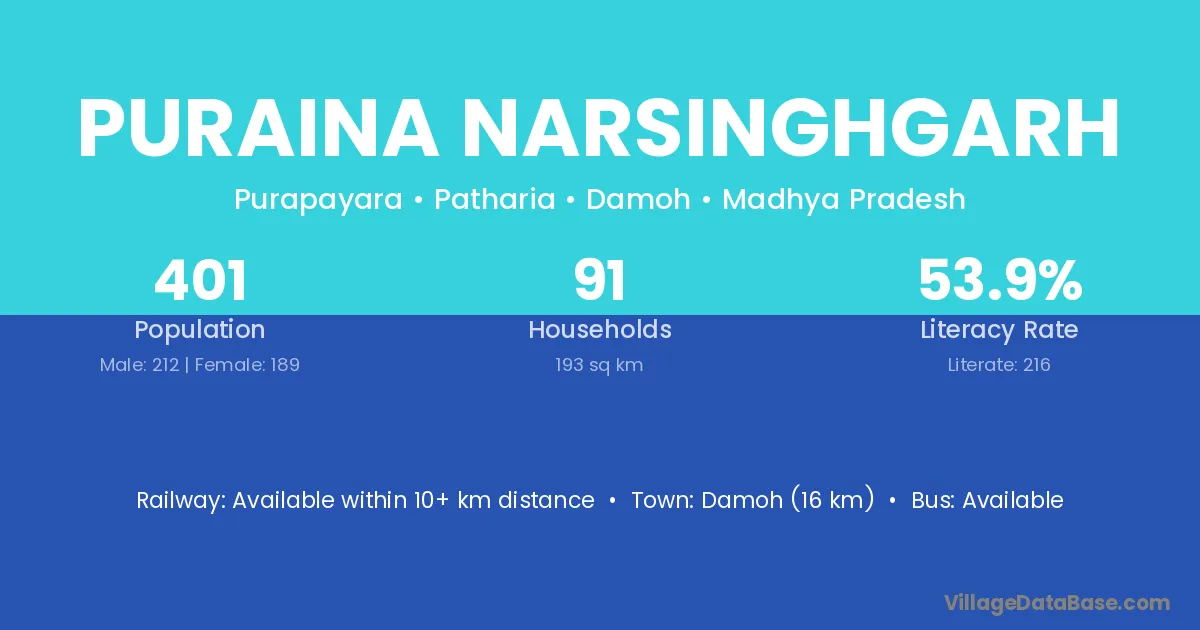 Damoh (16 km) is the nearest town to Puraina Narsinghgarh village for major economic activities and is located approximately 16 km away.