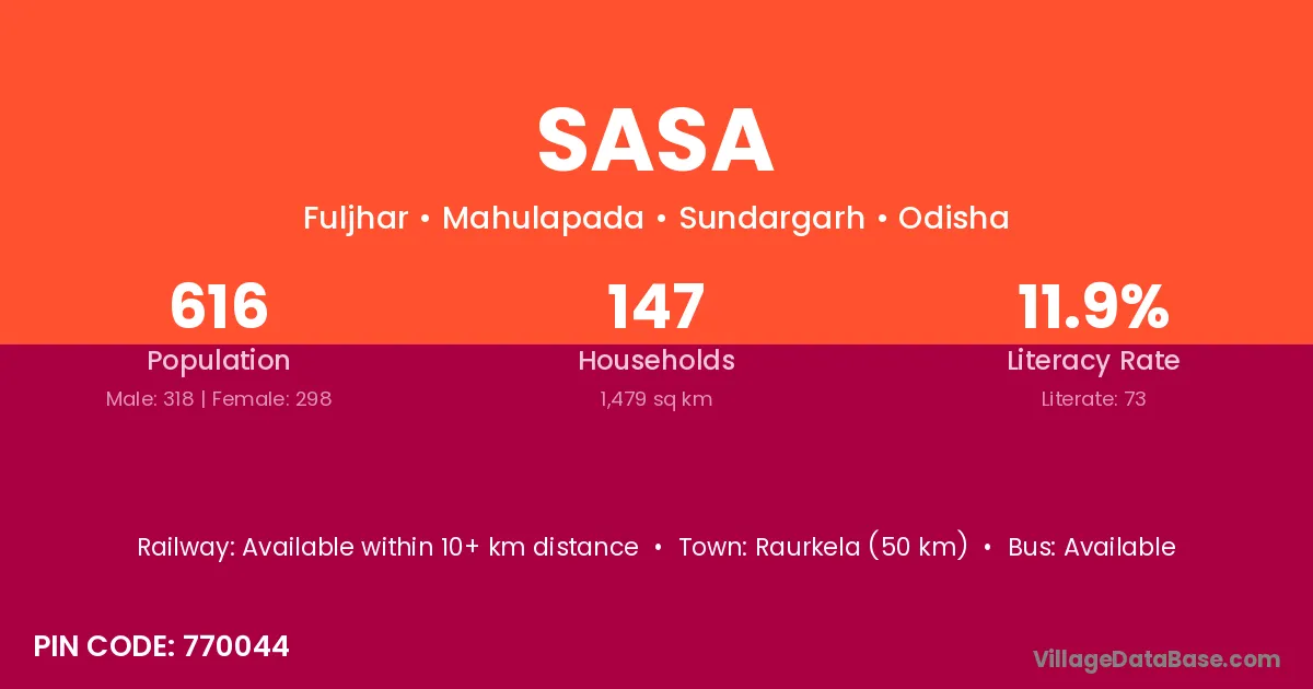 The literacy rate of Sasa village is 63.78%. Male literacy stands at 74.24% and female literacy at 51.71%.