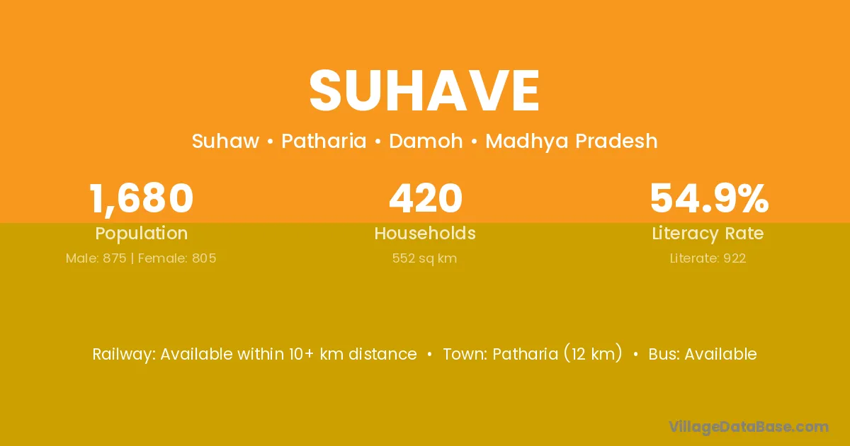 Patharia (12 km) is the nearest town to Suhave village for major economic activities and is located approximately 12 km away.