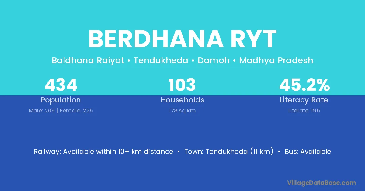 Tendukheda (11 km) is the nearest town to Berdhana Ryt village for major economic activities and is located approximately 11 km away.