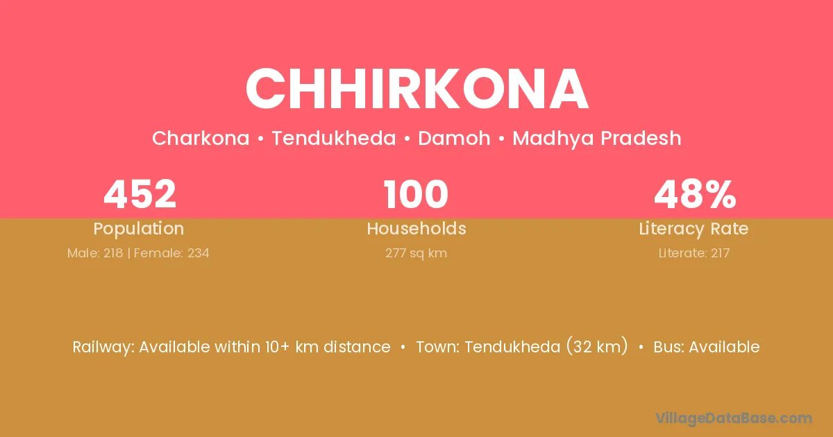 Tendukheda (32 km) is the nearest town to Chhirkona village for major economic activities and is located approximately 32 km away.