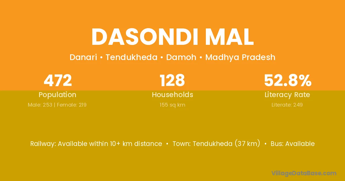 Tendukheda (37 km) is the nearest town to Dasondi Mal village for major economic activities and is located approximately 37 km away.