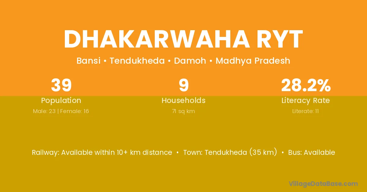 Tendukheda (35 km) is the nearest town to Dhakarwaha Ryt village for major economic activities and is located approximately 35 km away.