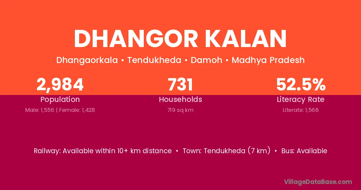 Tendukheda (7 km) is the nearest town to Dhangor Kalan village for major economic activities and is located approximately 7 km away.