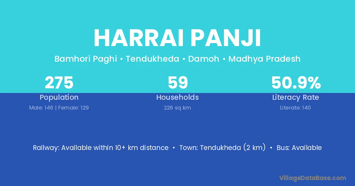 Tendukheda (2 km) is the nearest town to Harrai Panji village for major economic activities and is located approximately 2 km away.