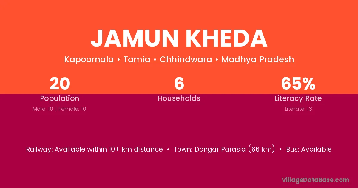 Tendukheda (3 km) is the nearest town to Jamun Kheda village for major economic activities and is located approximately 3 km away.