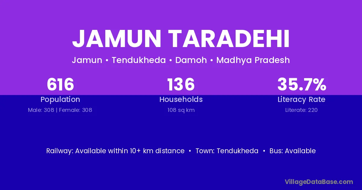 Jamun Taradehi village has a total population of 616 people, of which 308 are males and 308 are females.