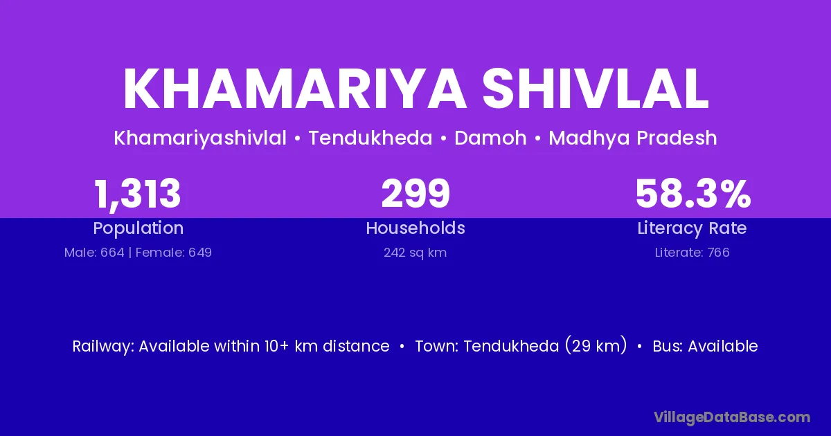 Khamariya Shivlal village has a total population of 1,313 people, of which 664 are males and 649 are females.