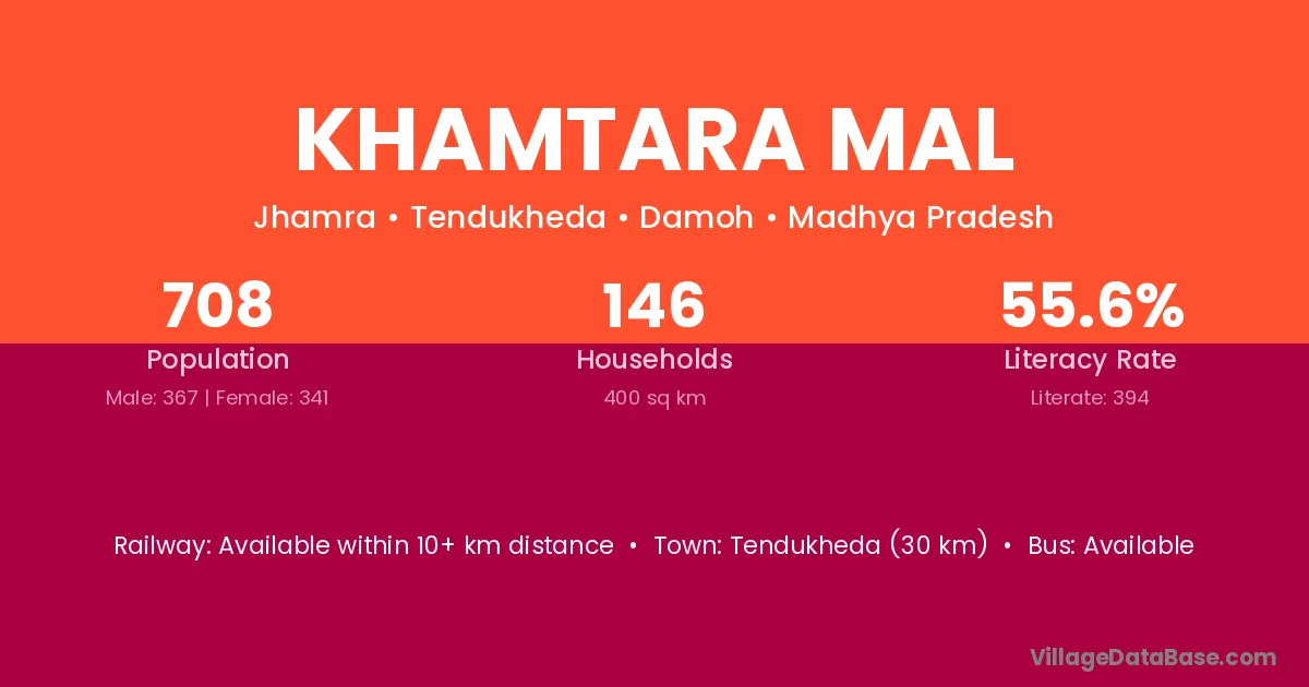 Tendukheda (30 km) is the nearest town to Khamtara Mal village for major economic activities and is located approximately 30 km away.