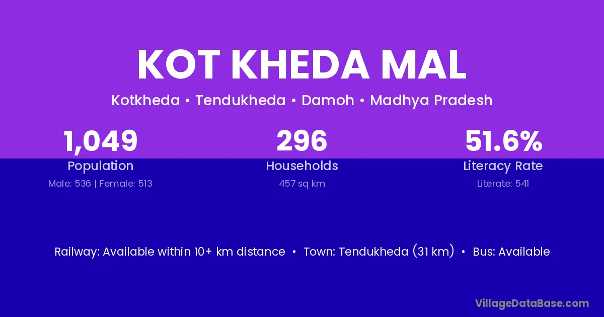Tendukheda (31 km) is the nearest town to Kot Kheda Mal village for major economic activities and is located approximately 31 km away.