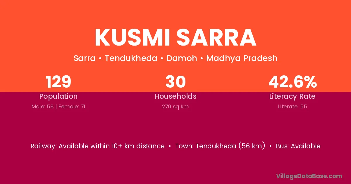 Tendukheda (56 km) is the nearest town to Kusmi Sarra village for major economic activities and is located approximately 56 km away.