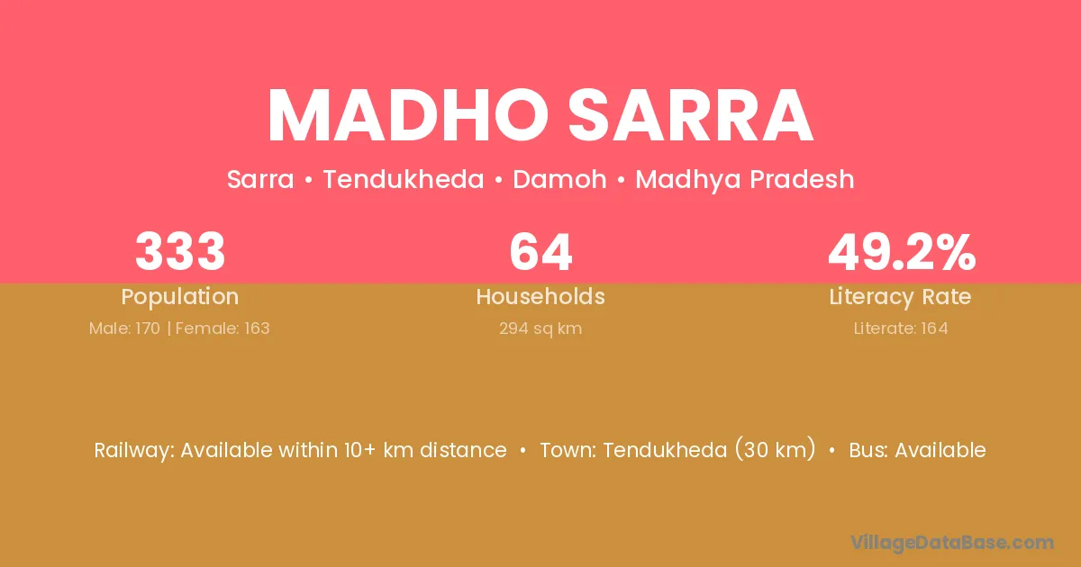 Tendukheda (30 km) is the nearest town to Madho Sarra village for major economic activities and is located approximately 30 km away.