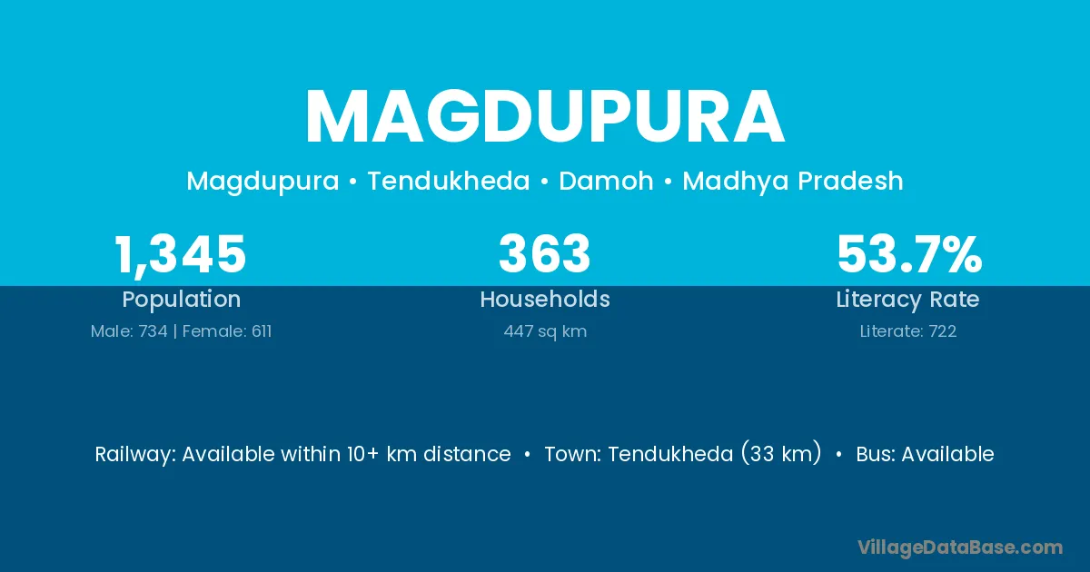 Tendukheda (33 km) is the nearest town to Magdupura village for major economic activities and is located approximately 33 km away.