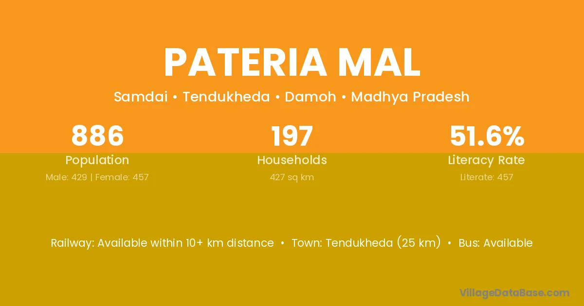 Tendukheda (25 km) is the nearest town to Pateria Mal village for major economic activities and is located approximately 25 km away.