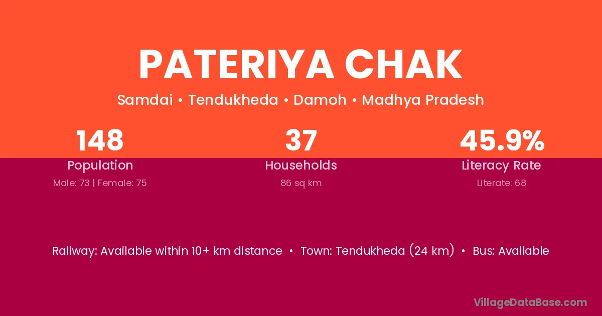 Tendukheda (24 km) is the nearest town to Pateriya Chak village for major economic activities and is located approximately 24 km away.