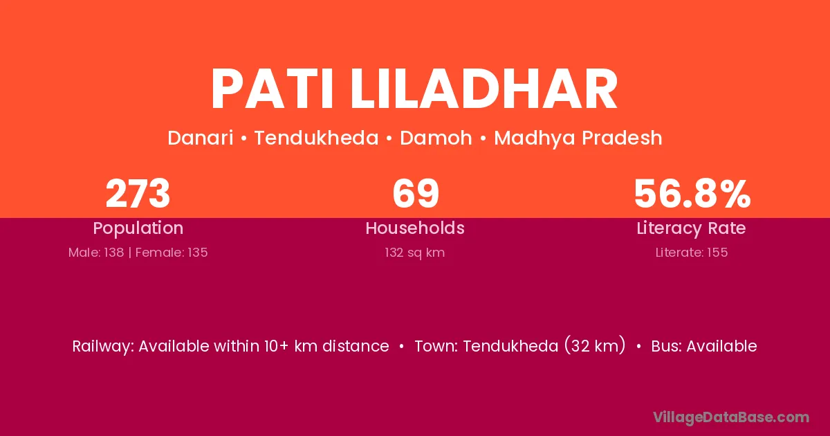 Tendukheda (32 km) is the nearest town to Pati Liladhar village for major economic activities and is located approximately 32 km away.