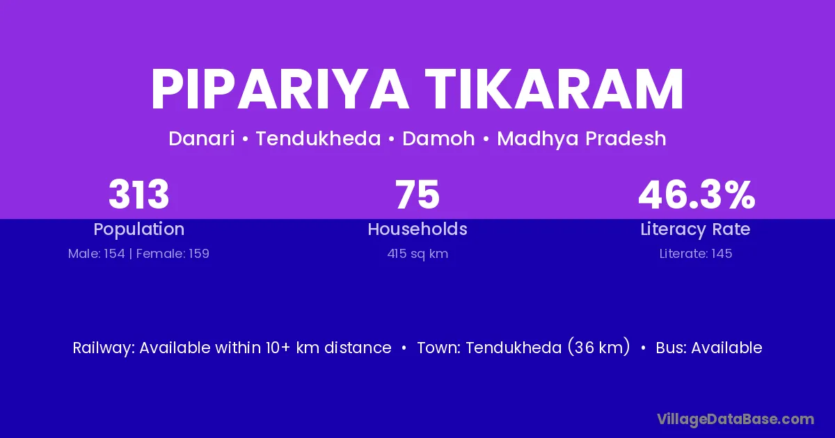 Tendukheda (36 km) is the nearest town to Pipariya Tikaram village for major economic activities and is located approximately 36 km away.