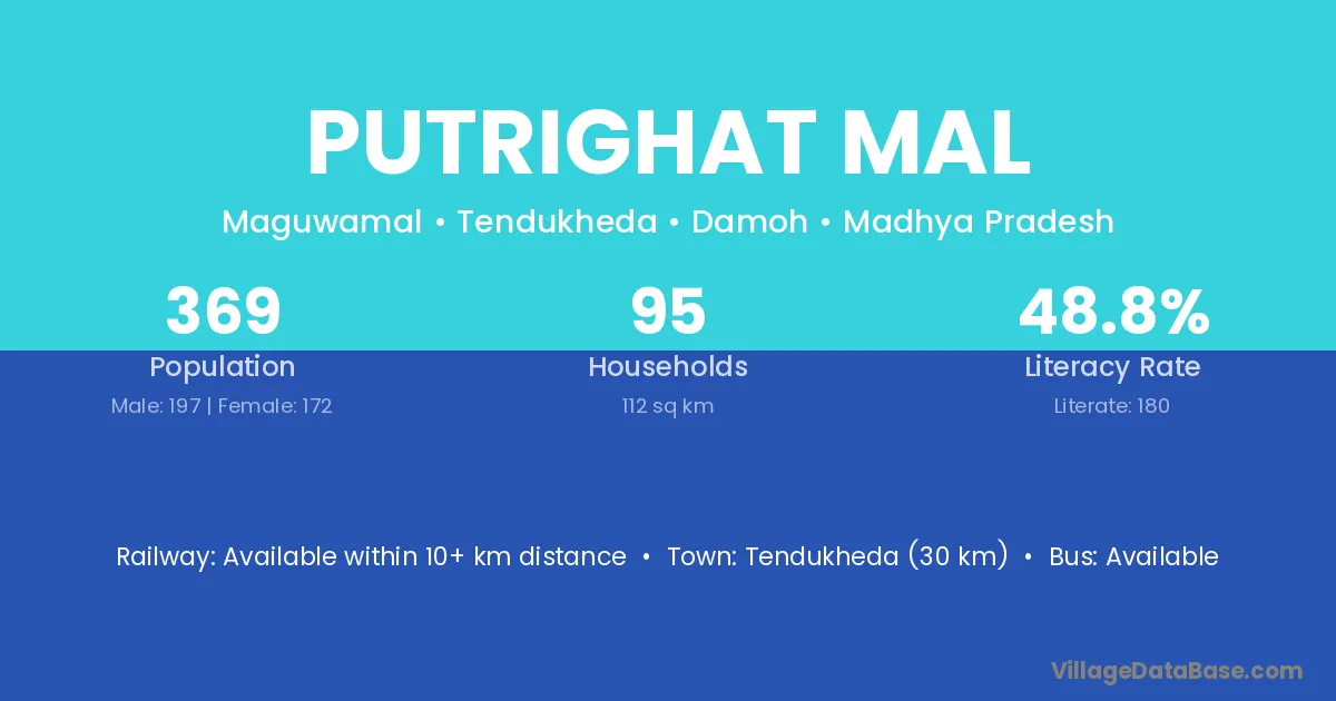 Tendukheda (30 km) is the nearest town to Putrighat Mal village for major economic activities and is located approximately 30 km away.