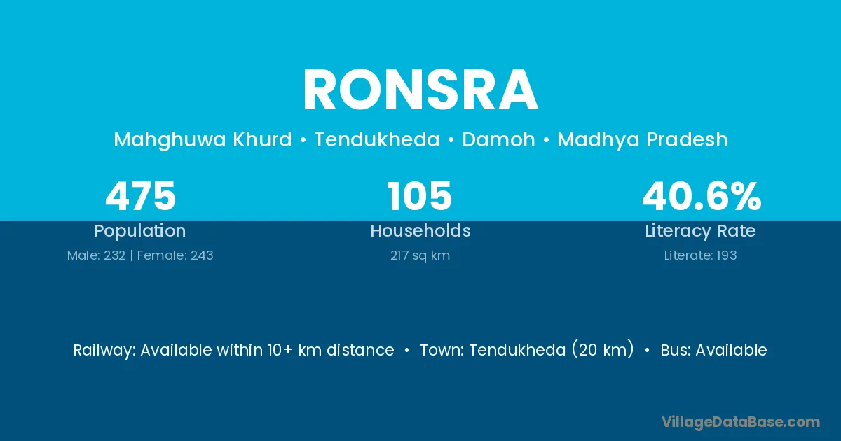 Tendukheda (20 km) is the nearest town to Ronsra village for major economic activities and is located approximately 20 km away.