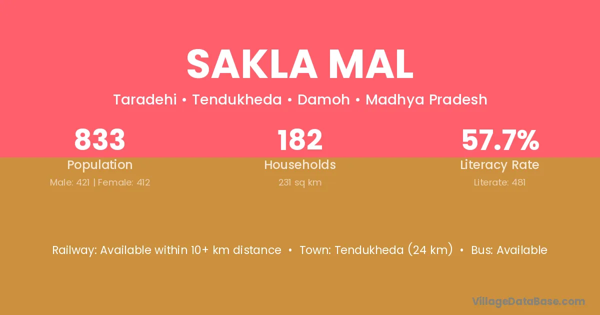 Tendukheda (24 km) is the nearest town to Sakla Mal village for major economic activities and is located approximately 24 km away.