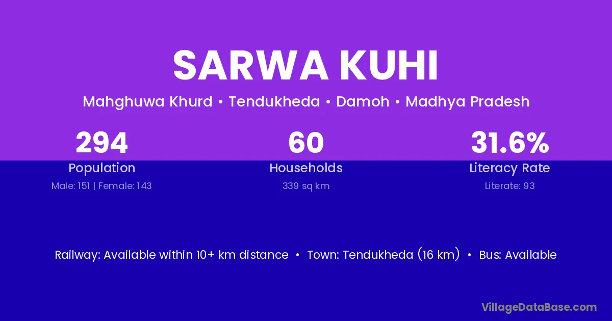 Tendukheda (16 km) is the nearest town to Sarwa Kuhi village for major economic activities and is located approximately 16 km away.