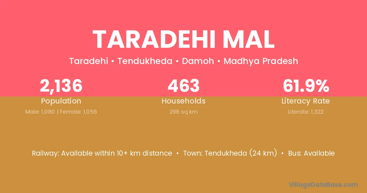 Tendukheda (24 km) is the nearest town to Taradehi Mal village for major economic activities and is located approximately 24 km away.