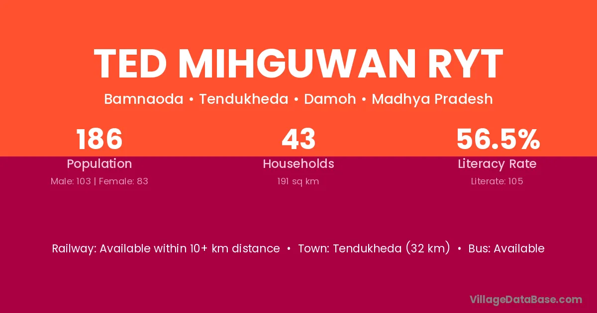 Ted Mihguwan Ryt village has a total population of 186 people, of which 103 are males and 83 are females.