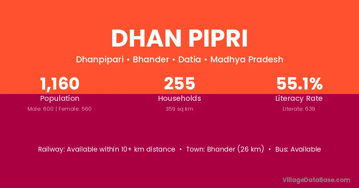 Bhander (26 km) is the nearest town to Dhan Pipri village for major economic activities and is located approximately 26 km away.