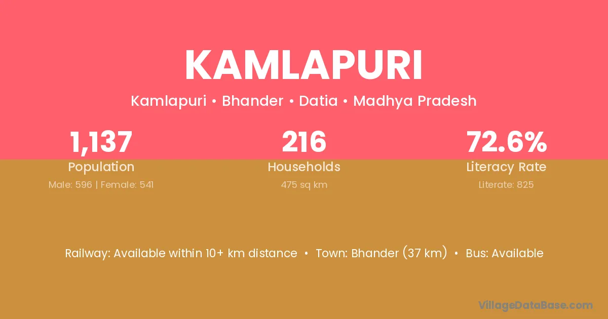Bhander (37 km) is the nearest town to Kamlapuri village for major economic activities and is located approximately 37 km away.