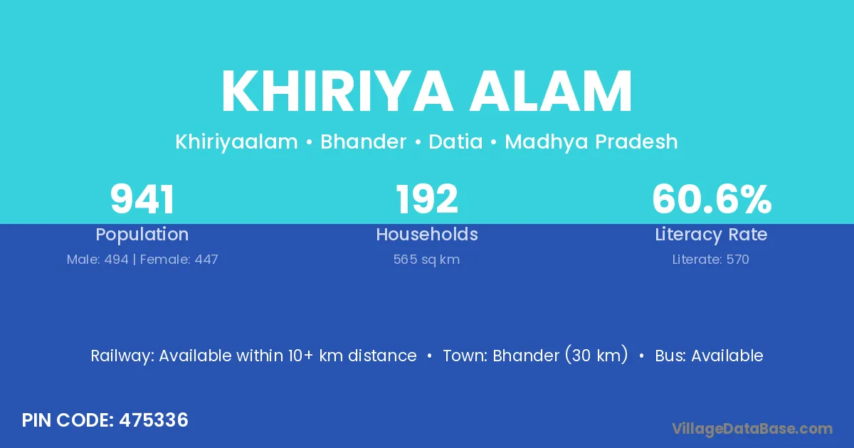 Bhander (30 km) is the nearest town to Khiriya Alam village for major economic activities and is located approximately 30 km away.