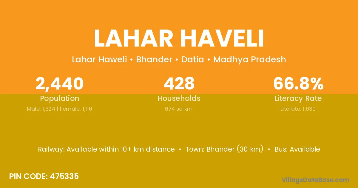 Bhander (30 km) is the nearest town to Lahar Haveli village for major economic activities and is located approximately 30 km away.