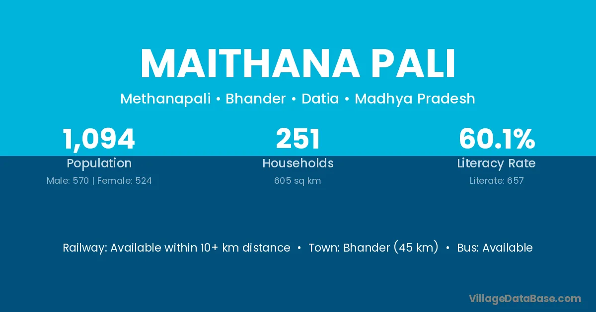Bhander (45 km) is the nearest town to Maithana Pali village for major economic activities and is located approximately 45 km away.