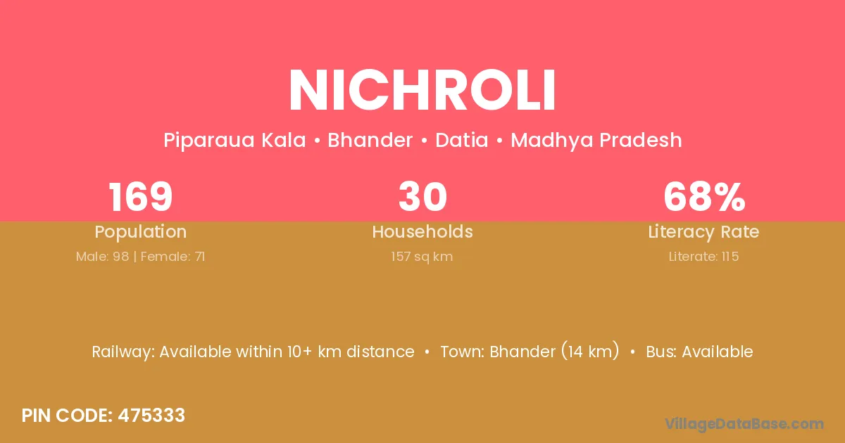 Bhander (14 km) is the nearest town to Nichroli village for major economic activities and is located approximately 14 km away.