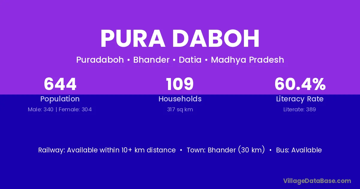 Bhander (30 km) is the nearest town to Pura Daboh village for major economic activities and is located approximately 30 km away.