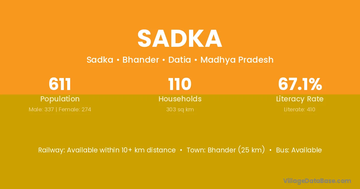 Bhander (25 km) is the nearest town to Sadka village for major economic activities and is located approximately 25 km away.