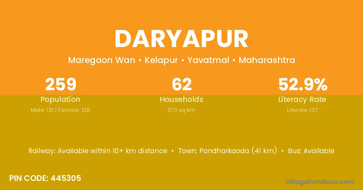The literacy rate of Daryapur village is 66.07%. Male literacy stands at 75.94% and female literacy at 55.54%.